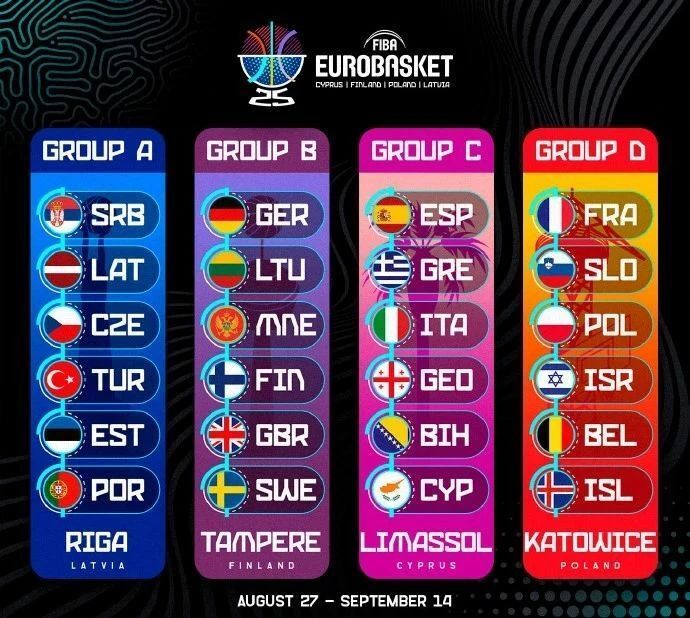 2025年欧锦赛将在8月27日-9月14日举办,斯洛文尼亚被分到D组,同组对手分别是法国、波兰、比利时、冰岛和以色列,前四名晋级淘汰赛阶段。